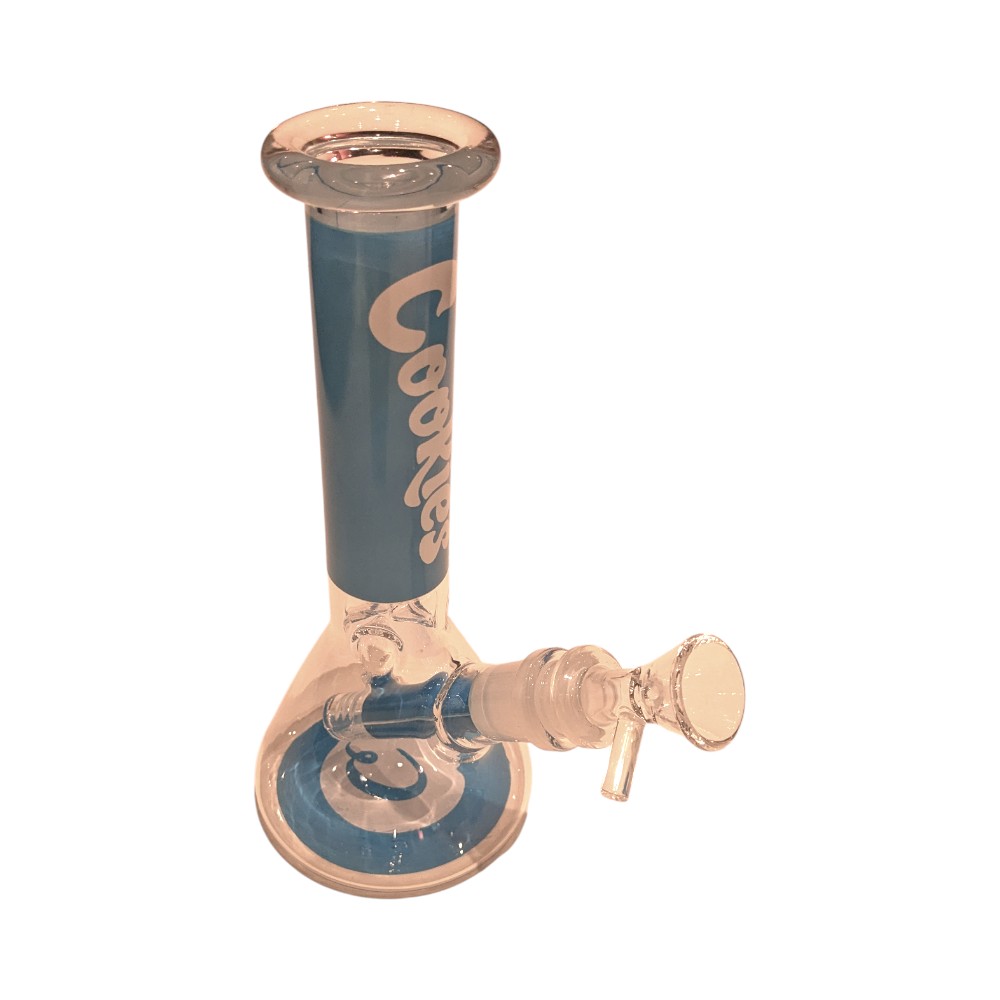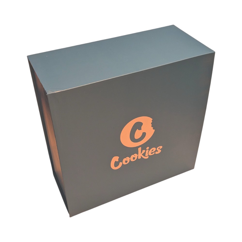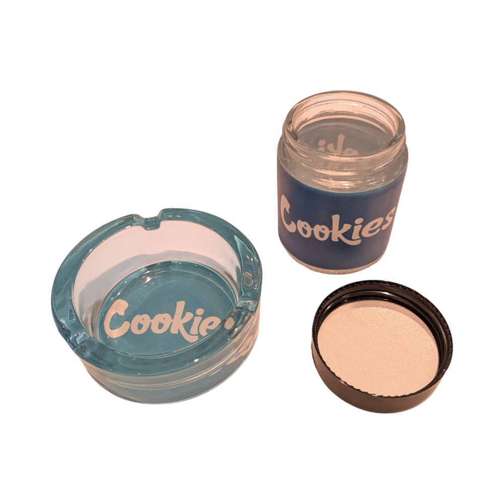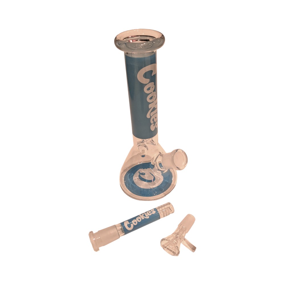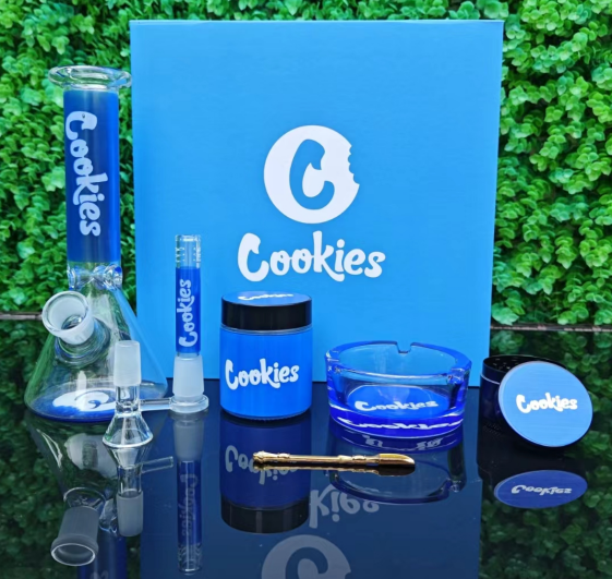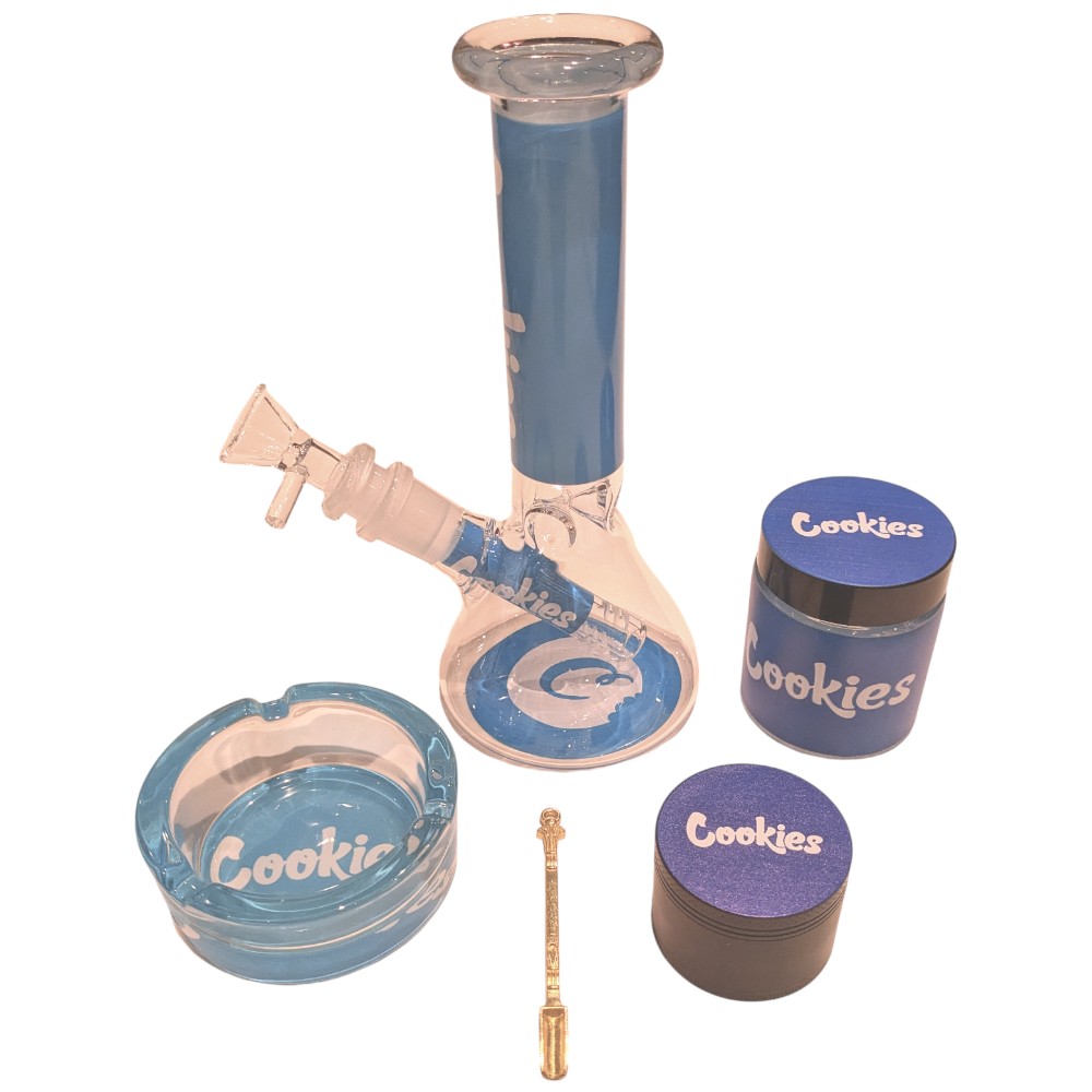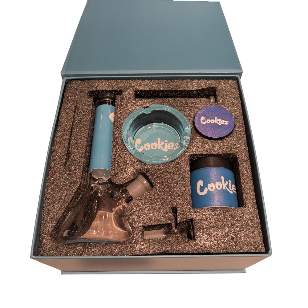 Cookies Beakerbong gaveboks med mye innhold. Her får du en beaker glassbong, metallgrinder, askebeger, glassbeholder og bongtool samlet i en praktisk oppbevaringseske.