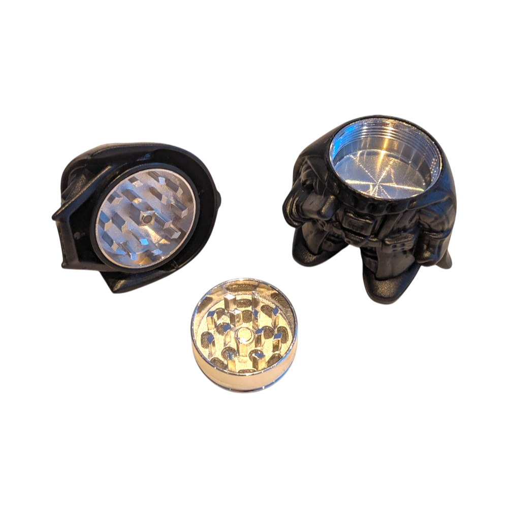 Darth metallgrinder med 3 deler. Grinderen har pollenrist for oppsamling av støv og magnetisk topplokk. Høyde på grinderen er 9 cm.