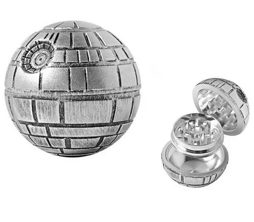 Kul Death Star metallgrinder med 3 deler. Grinderen har pollenrist og magnetisk topplokk. Diameter på grinderen er 50 mm. Høyde er 5cm.