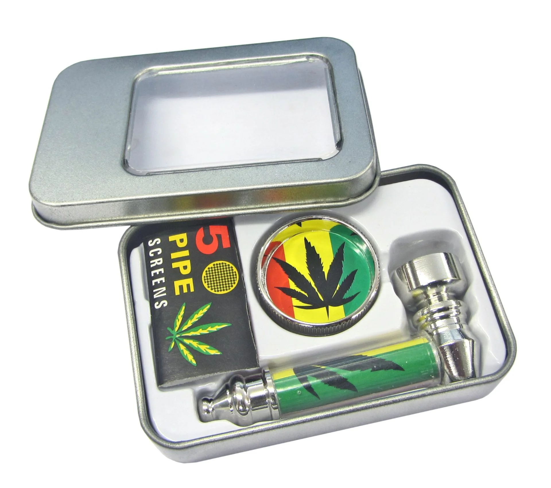 Praktisk gavesett med Rasta metallpipe, grinder og piperister. Lengde på metallpipen er 9 cm. Metallgrinderen har 2 deler og en diameter på 30mm. Det er også inkludert en pakke med 5 stk. 15mm piperister.