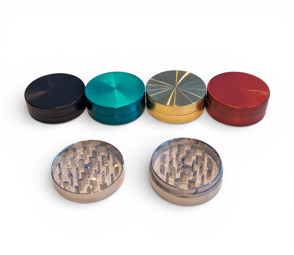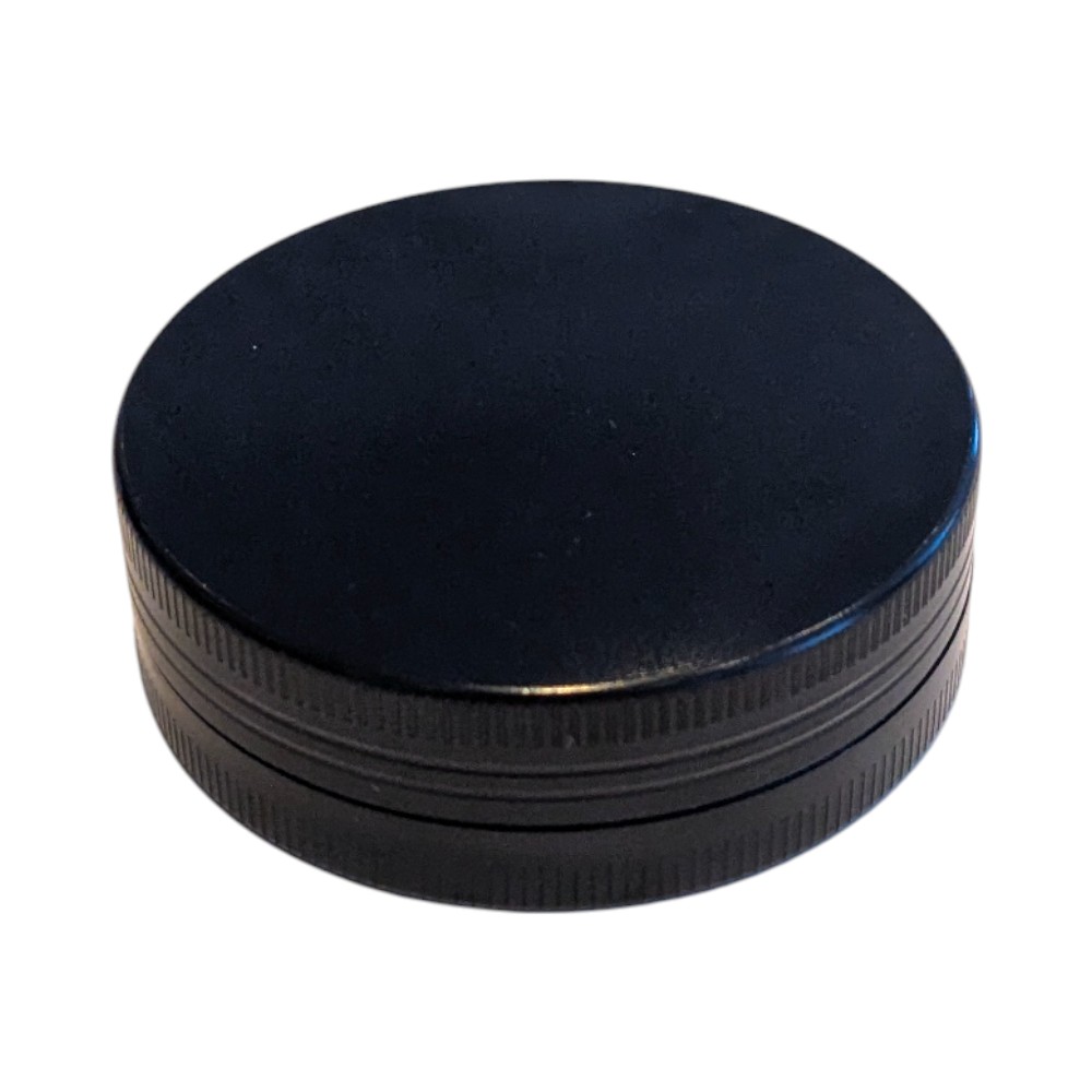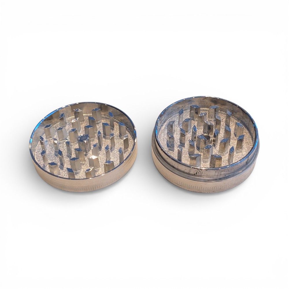 Metallgrinder med 2 deler. Grinderen har magnetisk topplokk. Diameter på grinderen er 55 mm og den har en høyde på 2 cm.