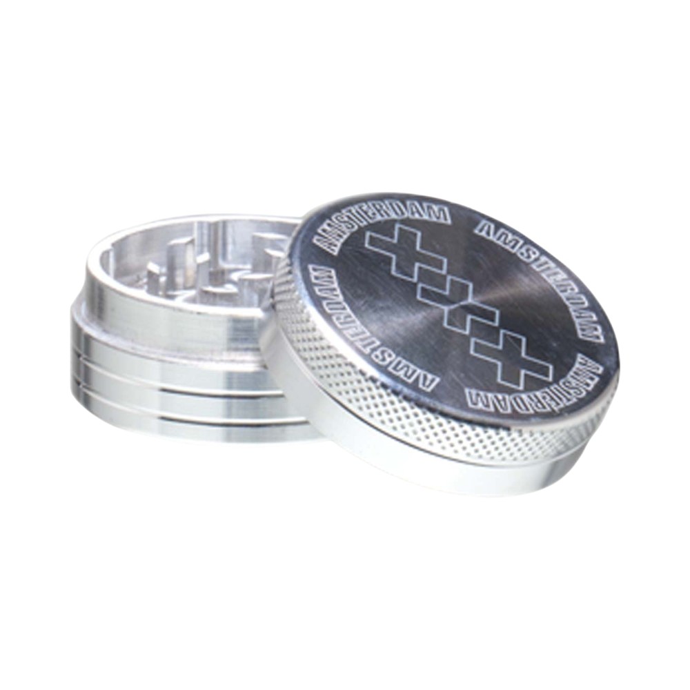 Sølvfarget metallgrinder med 2 deler fra Amsterdam. Diameter på grinderen er 40 mm. Nylon friksjonsring og magnetisk lokk sørger for godt feste. I tillegg har grinderen diamant formede bunntenner for optimal kverning av urter.