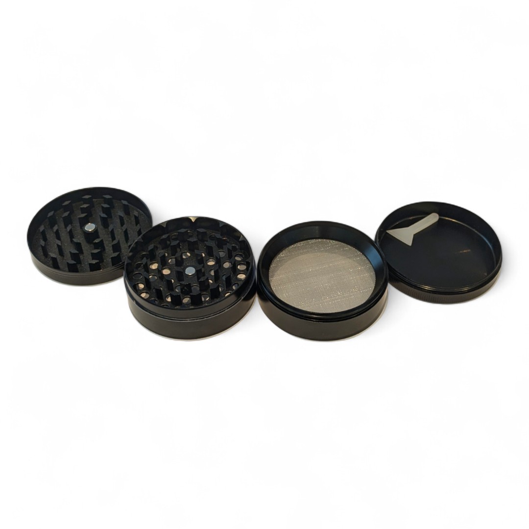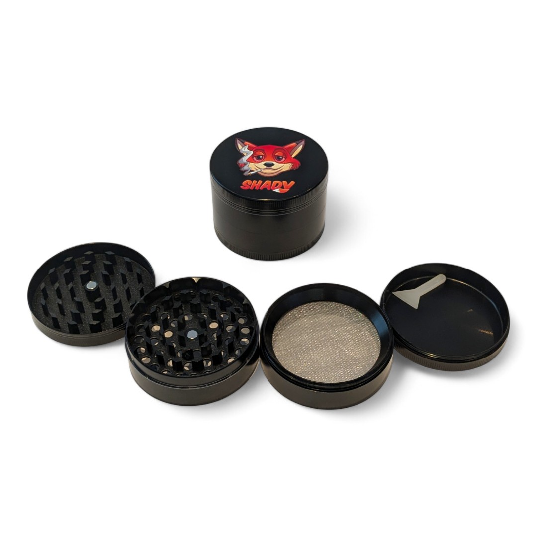 Ekstra stor Sort Shady XL metallgrinder med 4 deler og magnetisk lokk. Grinderen har pollenrist for oppsamling av støv. Diameter på grinderen er 60mm og den har en høyde på 44mm. Grinderen har nylonring for enkel friksjon og det følger med en grinderskrape.
