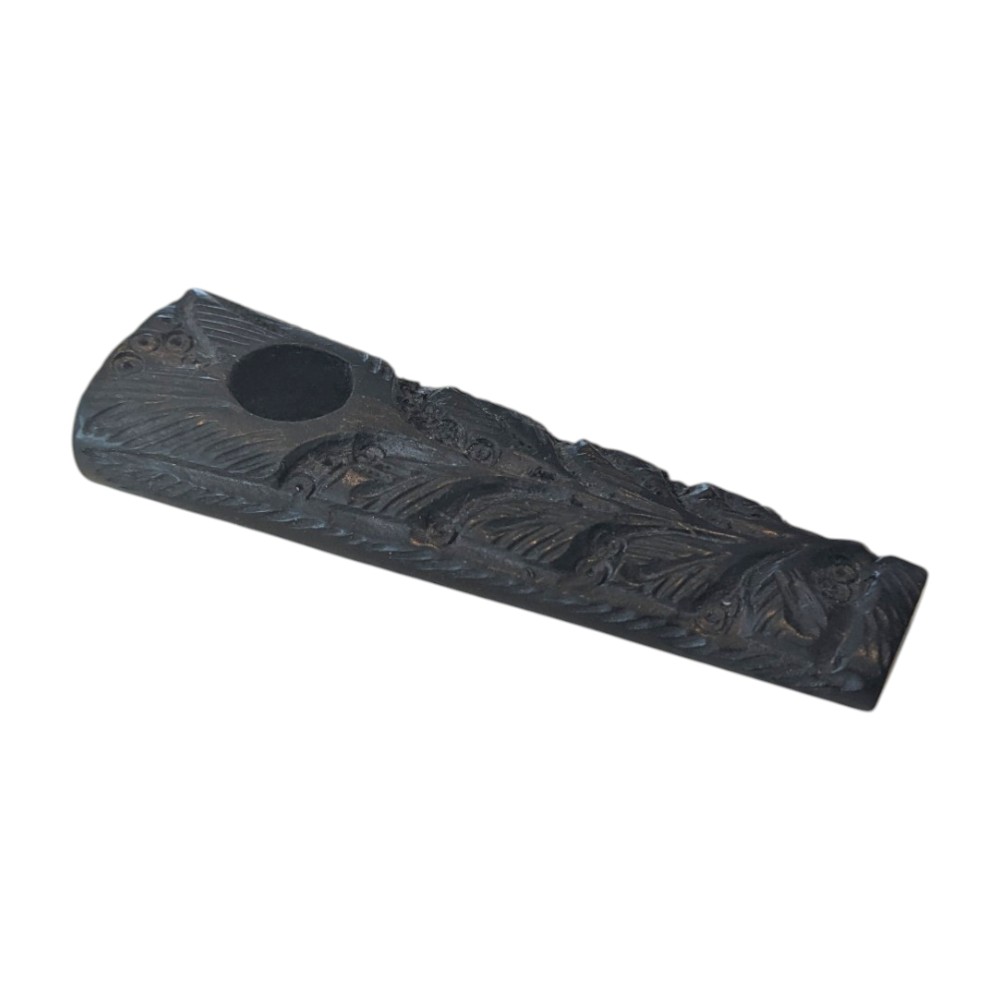 Carved ebonywood trepipe med fine utskjæringer. Lengde på trepipen er 9 cm. Sort trefarge.