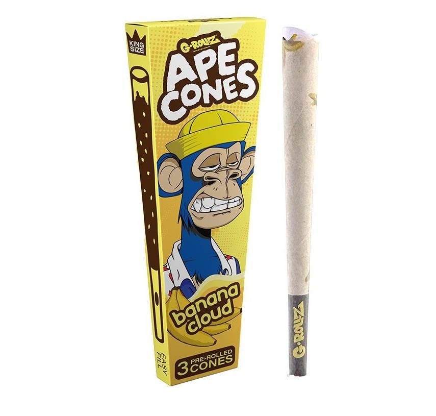 Banana Cloud Ape Cones fra nederlandske G-Rollz Amsterdam. Det er 3 stk. king size cones med smak i pakken.