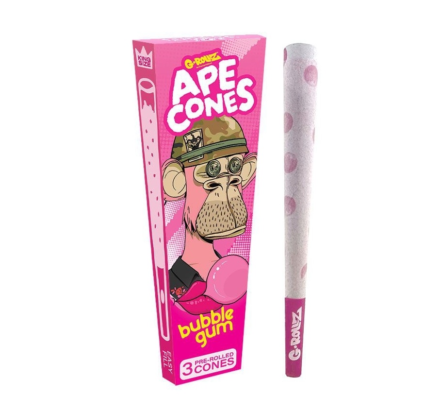 Bubblegum Ape Cones fra nederlandske G-Rollz Amsterdam. Det er 3 stk. king size cones med smak i pakken.