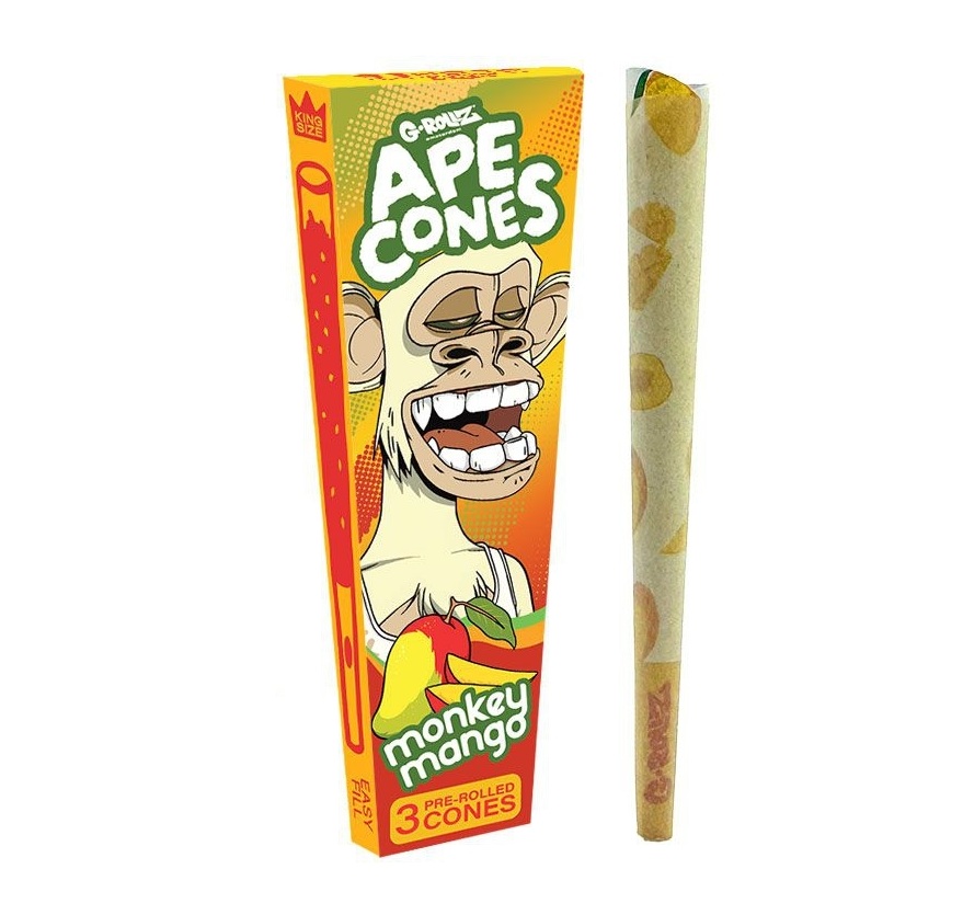 Monkey Mango Ape Cones fra nederlandske G-Rollz Amsterdam. Det er 3 stk. king size cones med smak i pakken.