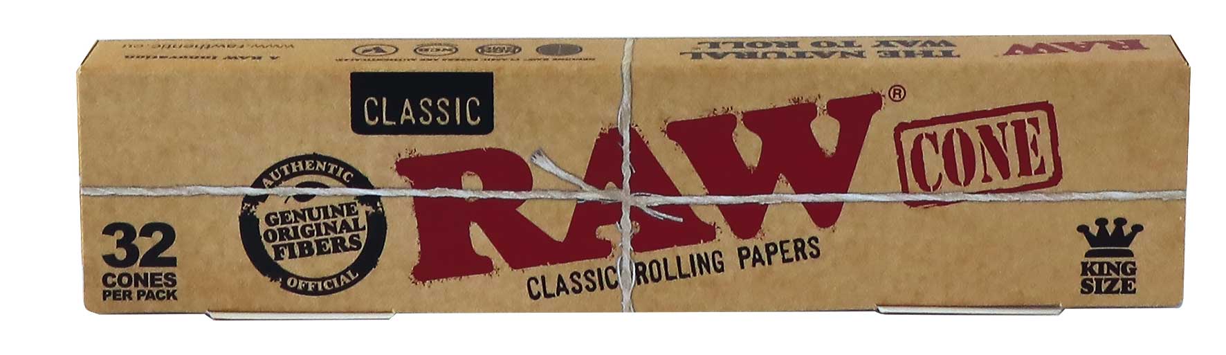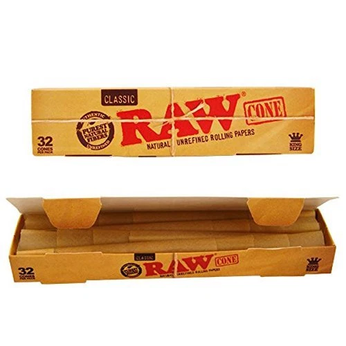 RAW Classic King Size Cones – 32 stk er perfekt for deg som vil ha ekte RAW-følelse uten å rulle selv. Disse ferdigrullede kjeglene er laget av det klassiske, ublekede RAW-papiret med naturlige plantefibre og den velkjente vannmerke-strukturen som gir jevn og kontrollert brenning.