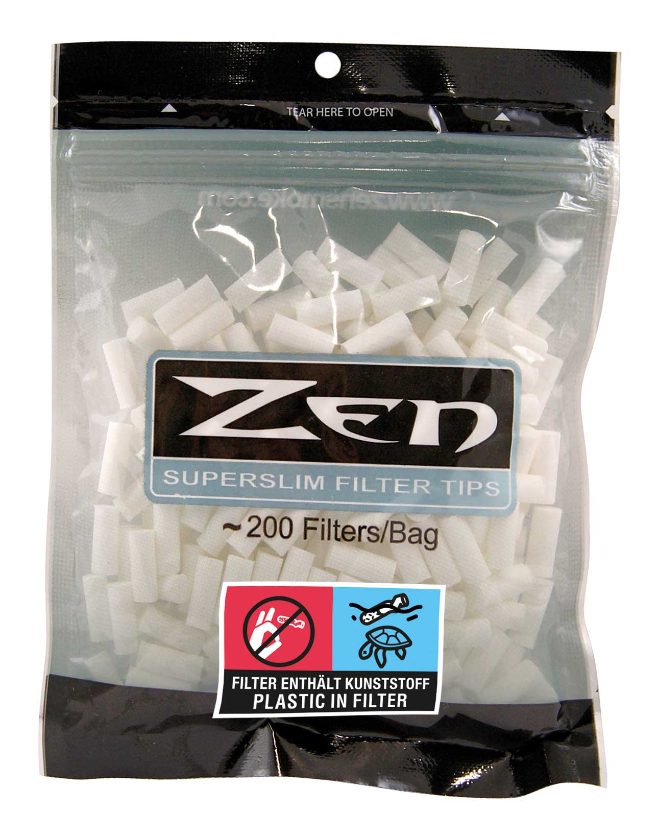 Zen Superslim Filters. Pakken inneholder 200 stk. filter tips av bomull. Diameter på filtrene er 6mm og de har en lengde på 15mm.