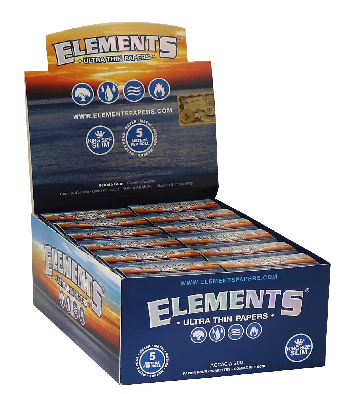 Kartong med Elements king size slim papir på rull. Det er 24 pakker i esken. 5 meter papir per pakke.