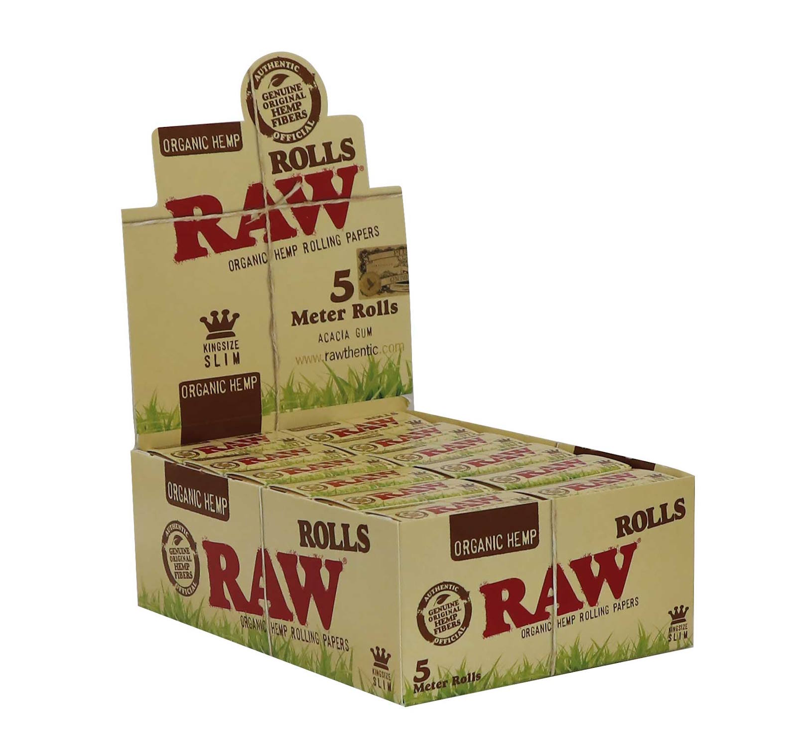 Kartong med RAW Organic king size slim papir på rull. Det er 24 pakker i esken. 5 meter papir per pakke.