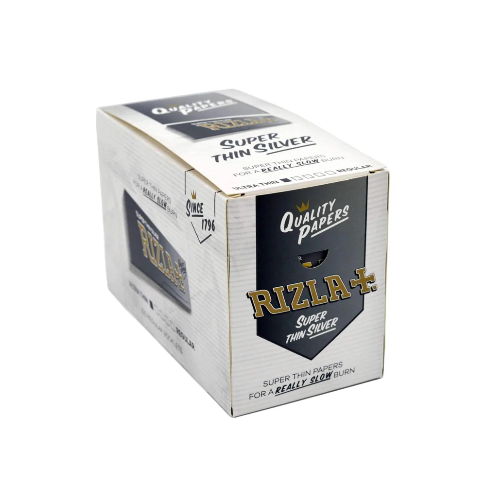 Hel kartong med Rizla Silver regular size rullepapir. Silver er super tynt rullepapir.  Det er 100 pakker i esken. Hver pakke inneholder 50 papir.