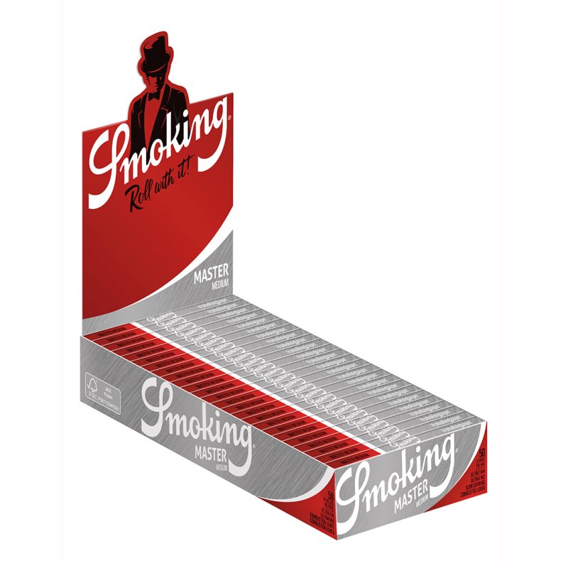 Kartong Smoking Master Medium Size Rullepapir inneholder 25 pakker av den ultratynne Master-serien fra Smoking. Hver pakke inneholder 50 papir i Medium (1 1/4″) størrelse.