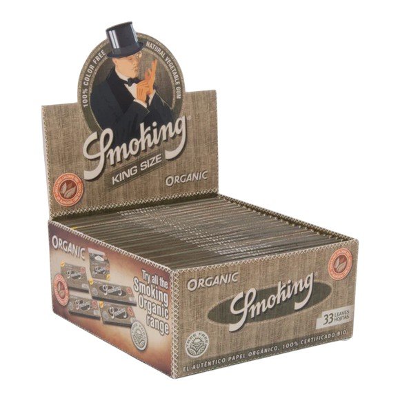 Hel kartong med Smoking Organic King Size rullepapir. Det er 50 pakker i esken. Hver pakke inneholder 33 papir. Ultratynt ubleket rullepapir. Størrelse på papirene er 108 x 44 mm.