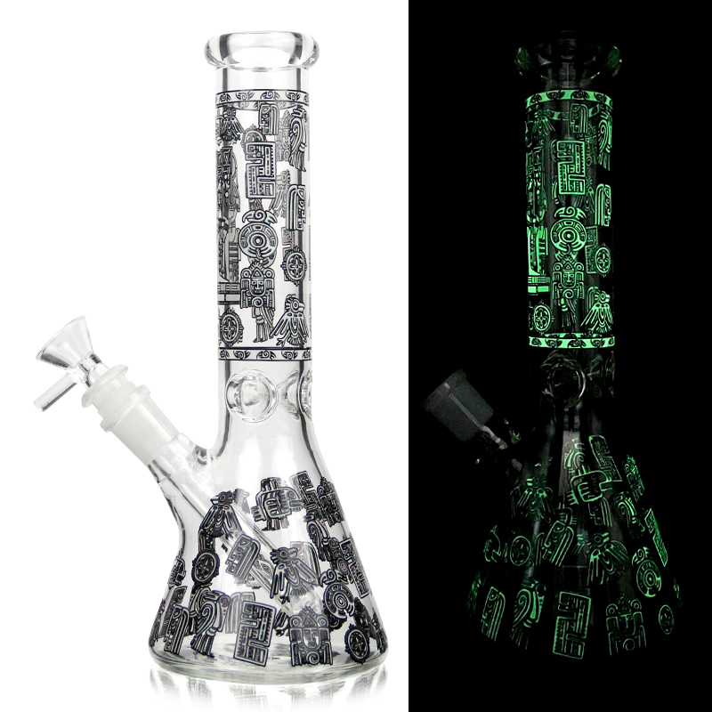 Selvlysende beaker glassbong med Mayan design. Glassbongen har hakk for isbiter for ekstra kjøling. Høyde på glassbongen er 25 cm. Glass adapter med diffuser og pipebrønn med håndtak.