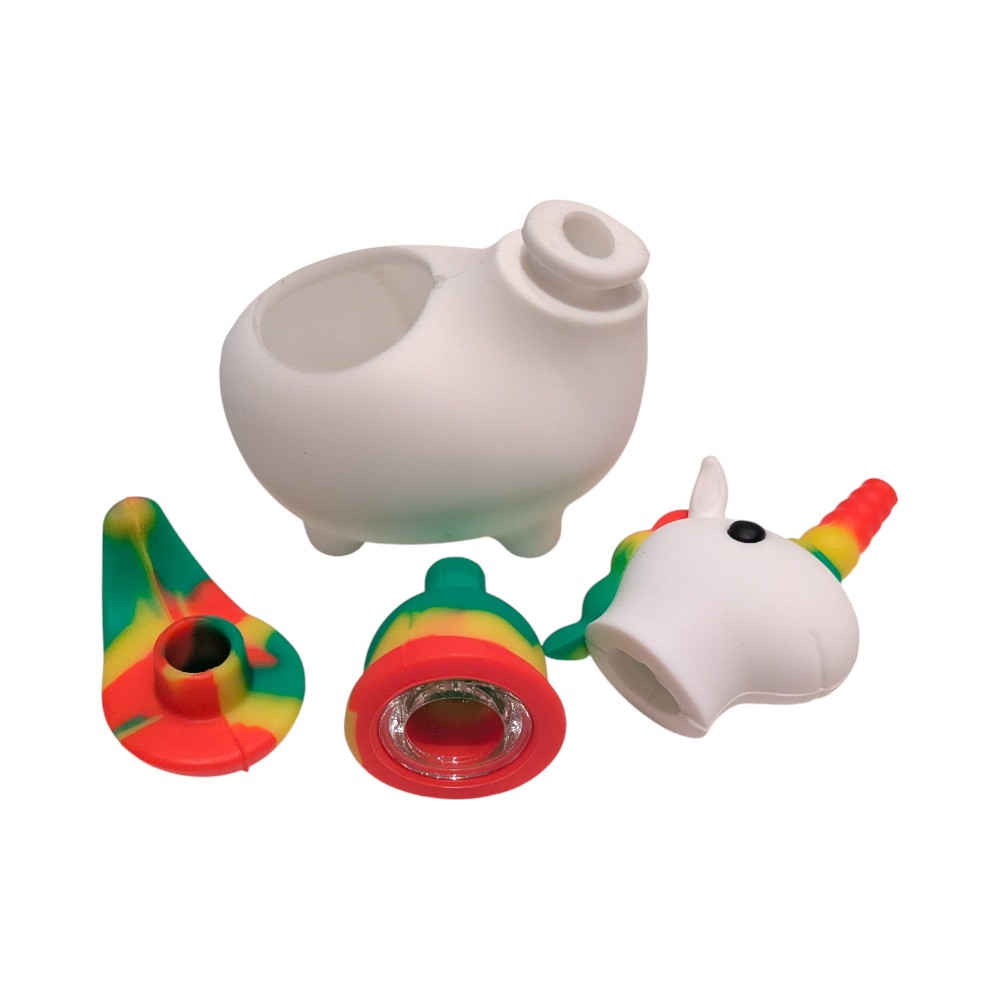 Stilig Unicorn silikonbong med glassbrønn. Høyde på bongen er 12 cm. Den har avtagbare deler for enkel rengjøring.